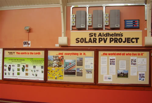The inverter will gather data on a wide range of values including mains and PV voltage, current, operating hours and PV generated kWh. It will show the main figures on the front cover display, but the system can also be monitored in a number of different ways such as a remote display (large public one or desktop), on a local computer, or to the world via the internet.